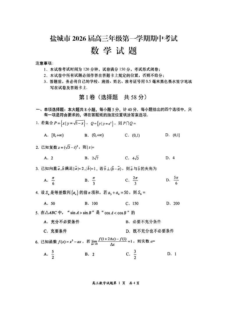 盐城市2026届高三年级第一学期期中考试 数学.pdf
