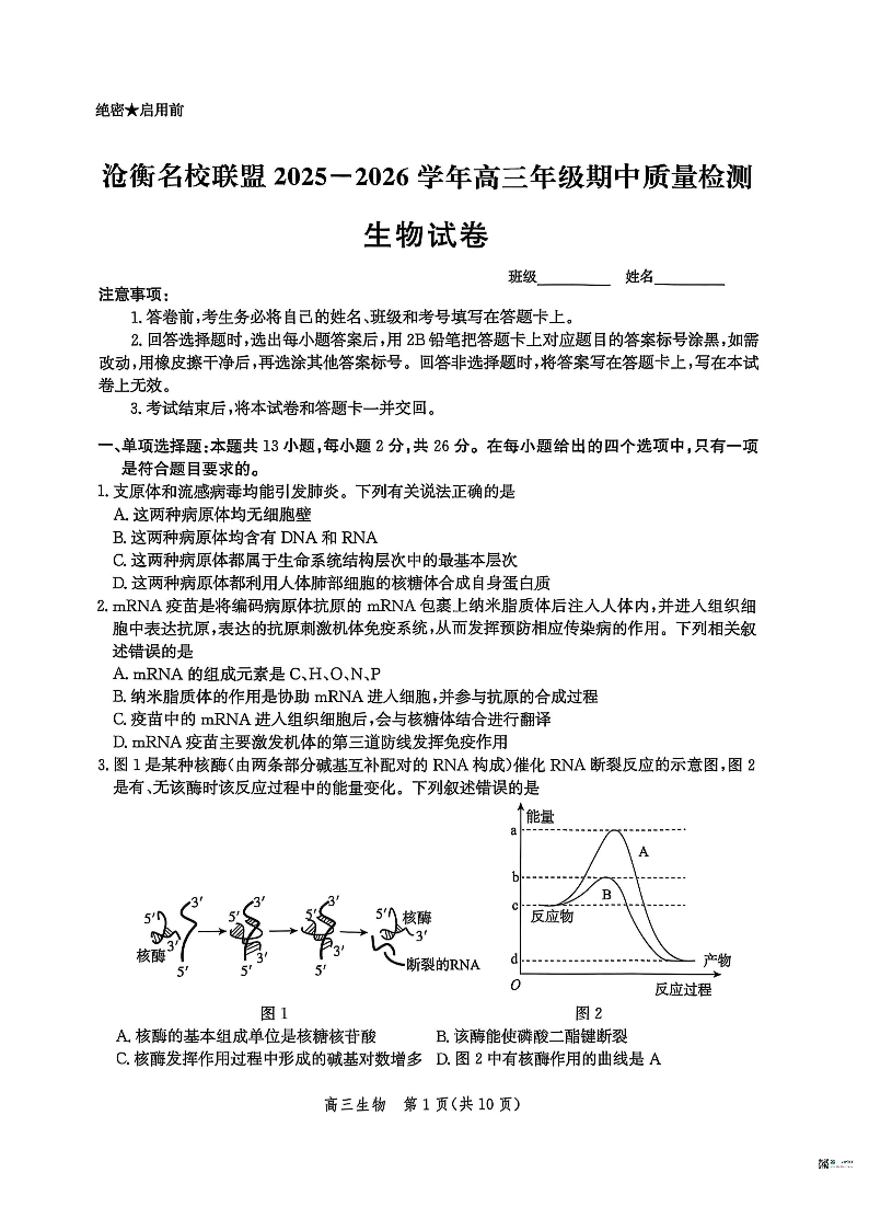 沧衡名校联盟2025-2026学年高三年级期中质量检测 生物试题(含答案).pdf