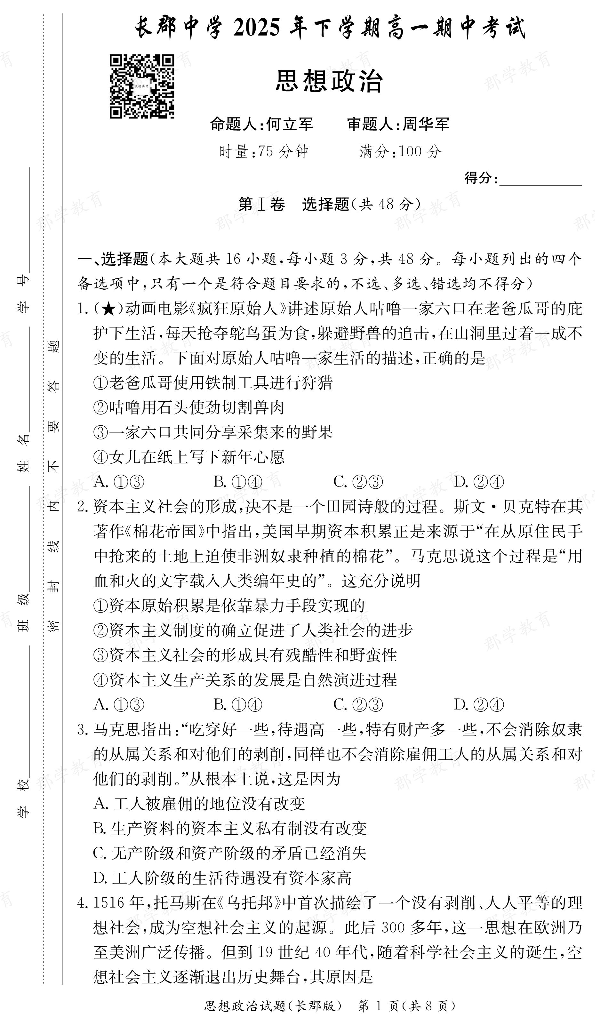 湖南省·炎德英才大联考 长郡中学2025-2026学年高一上学期期中考试 政治.pdf
