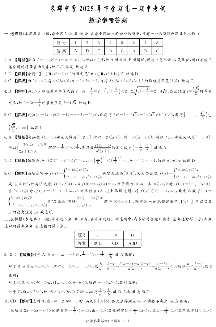 湖南省·炎德英才大联考 长郡中学2025-2026学年高一上学期期中考试 数学答案.pdf