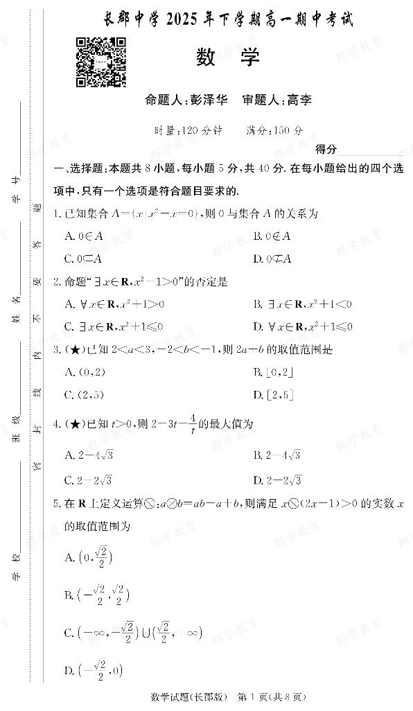 湖南省·炎德英才大联考 长郡中学2025-2026学年高一上学期期中考试 数学.pdf