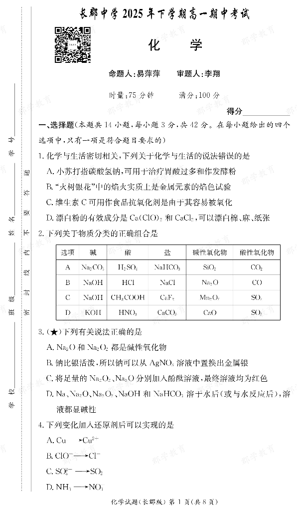 湖南省·炎德英才大联考 长郡中学2025-2026学年高一上学期期中考试 化学.pdf
