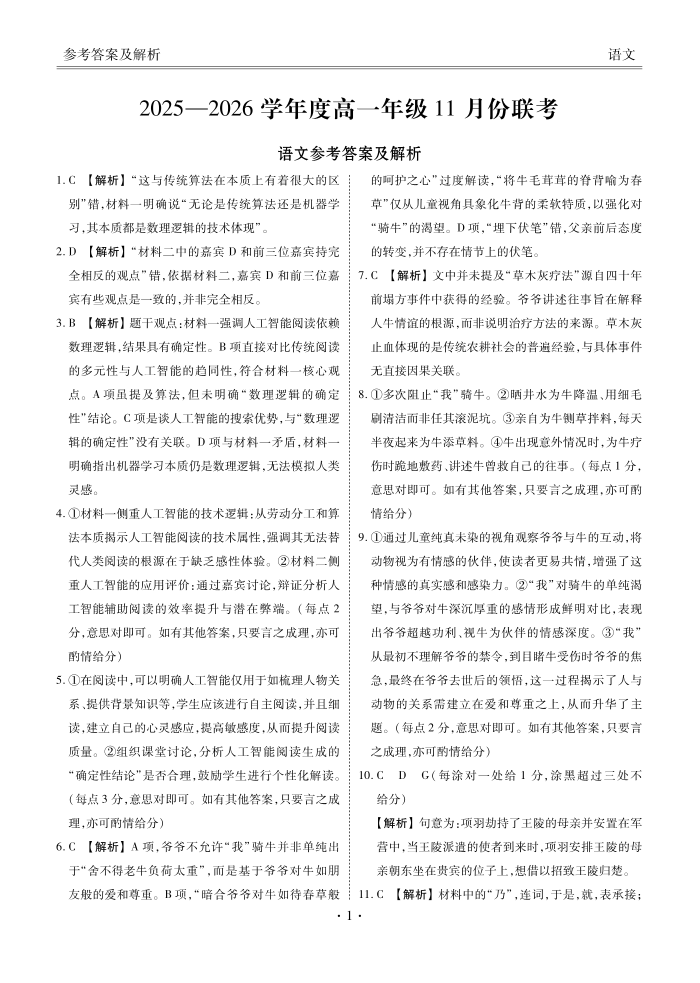 2025-2026学年度高一年级11月份联考 语文答案.pdf