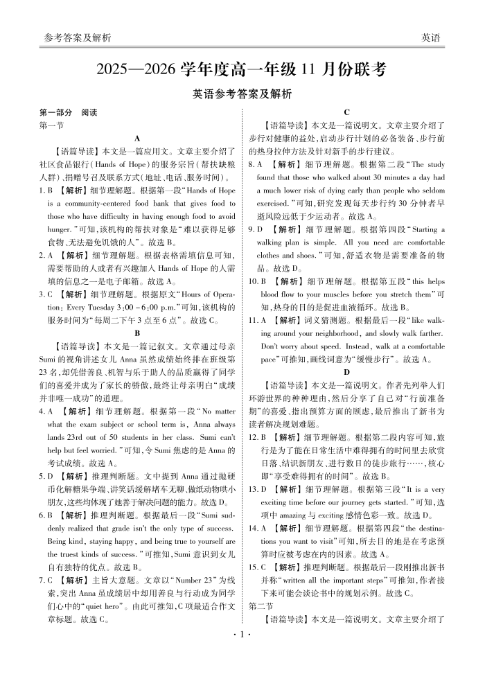 2025-2026学年度高一年级11月份联考 英语答案.pdf