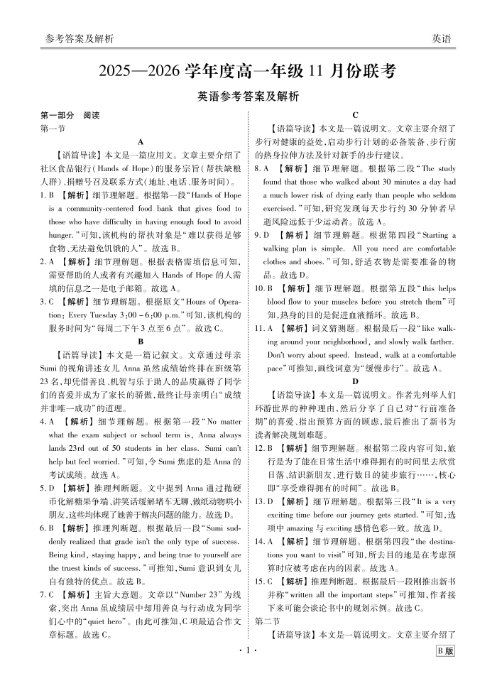 2025-2026学年度高一年级11月份联考 英语B版答案.pdf