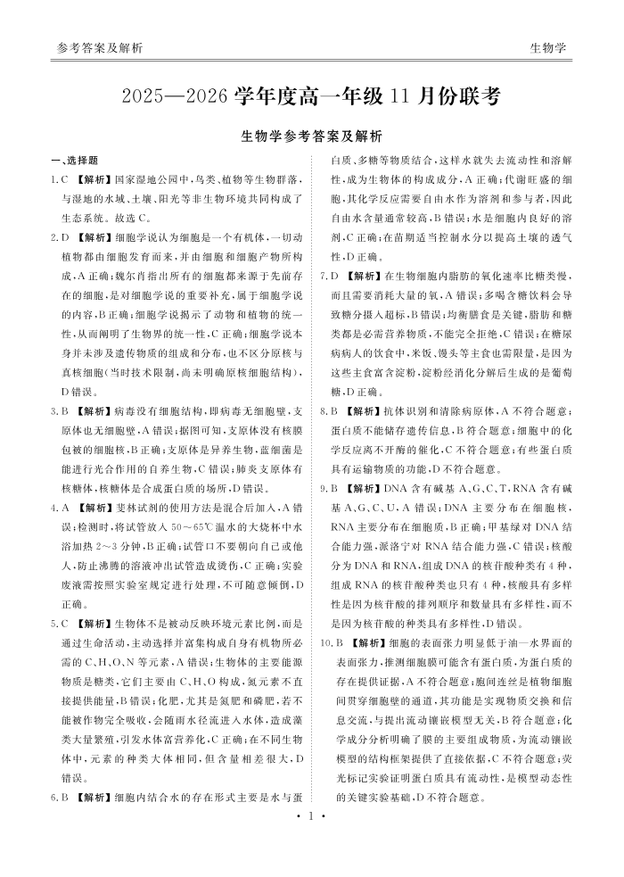 2025-2026学年度高一年级11月份联考 生物答案.pdf