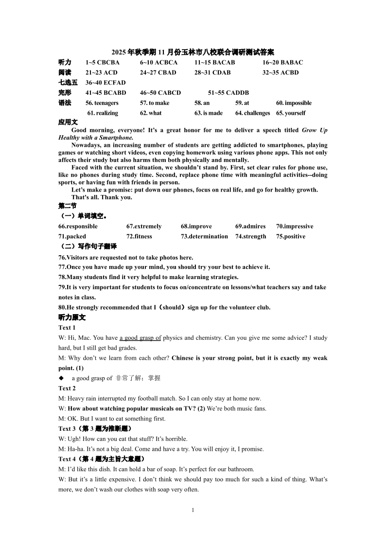 玉林八校联合2025年秋季期中 高一英语答案.pdf