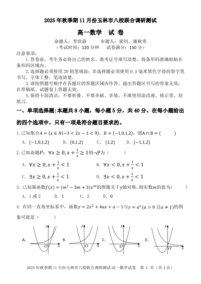 玉林八校联合2025年秋季期中 高一数学.pdf