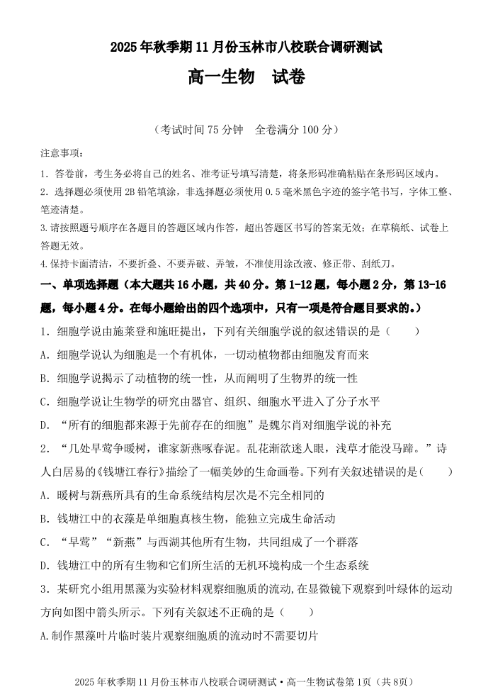 玉林八校联合2025年秋季期中 高一生物.pdf
