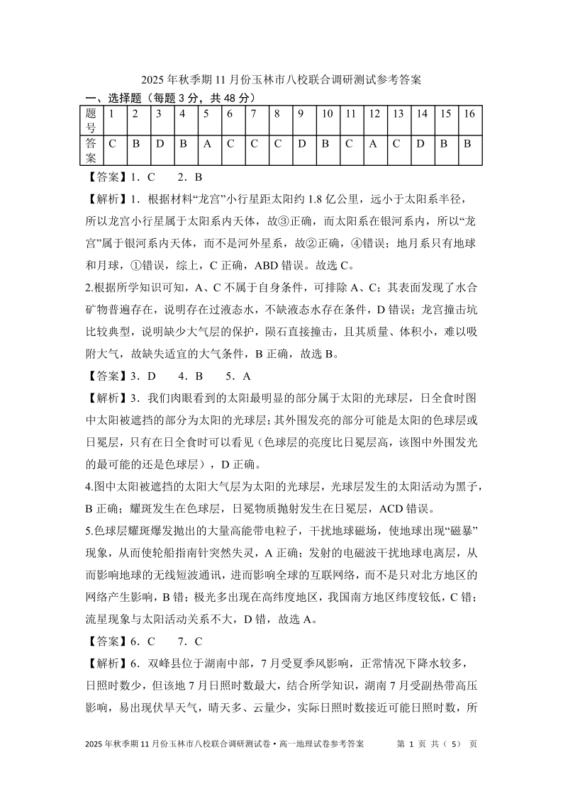 玉林八校联合2025年秋季期中 高一地理答案.pdf