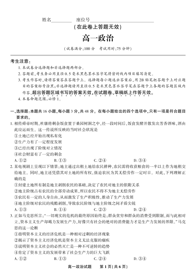 政治·安徽省皖江名校联盟2025-2026学年高一上学期期中联考.pdf
