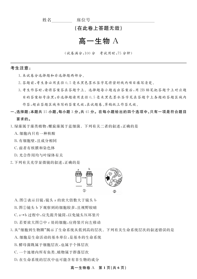 生物A·安徽省皖江名校联盟2025-2026学年高一上学期期中联考.pdf