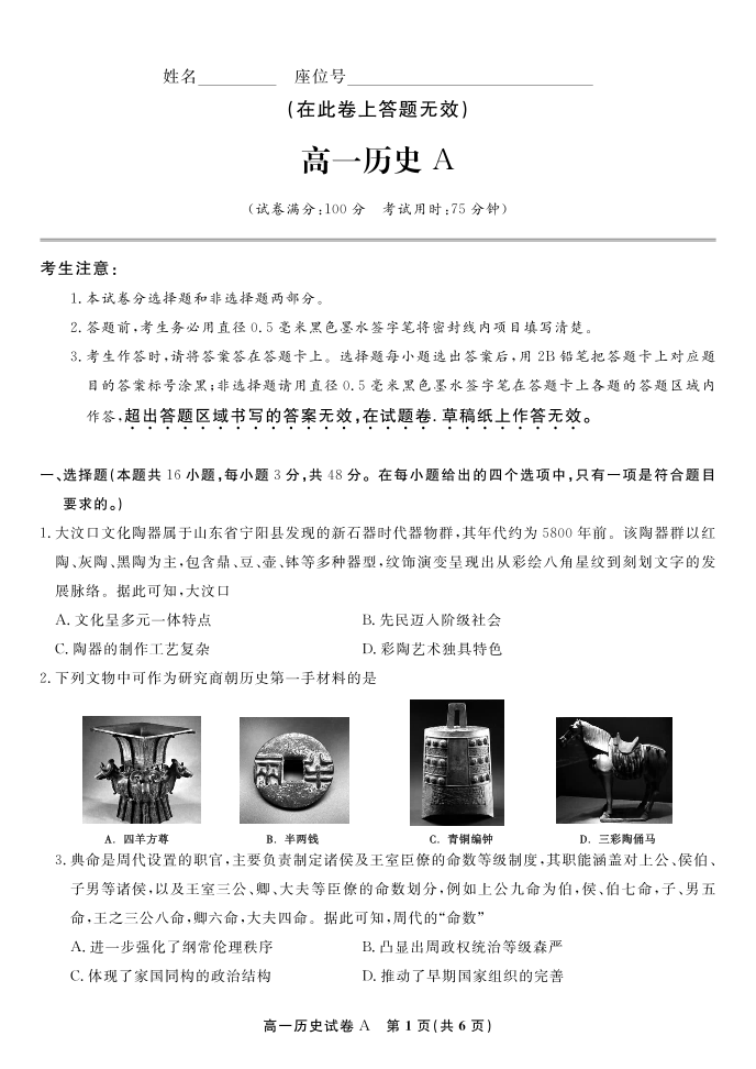 历史A·安徽省皖江名校联盟2025-2026学年高一上学期期中联考.pdf