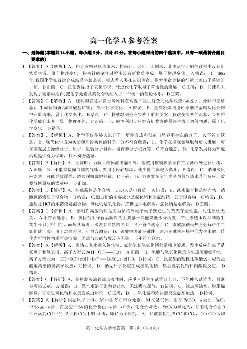 化学答案A·安徽省皖江名校联盟2025-2026学年高一上学期期中联考.pdf