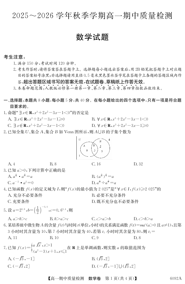 【数学】安徽省华师联盟2025~2026学年秋季学期高一期中质量检测.pdf
