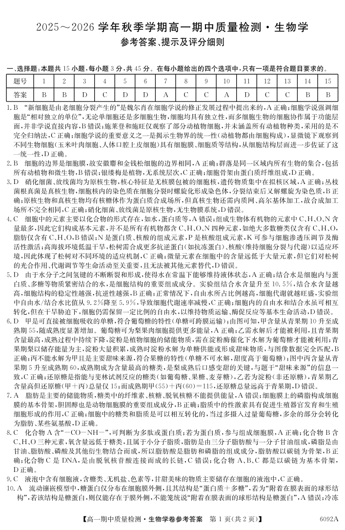【生物答案】安徽省华师联盟2025~2026学年秋季学期高一期中质量检测.pdf