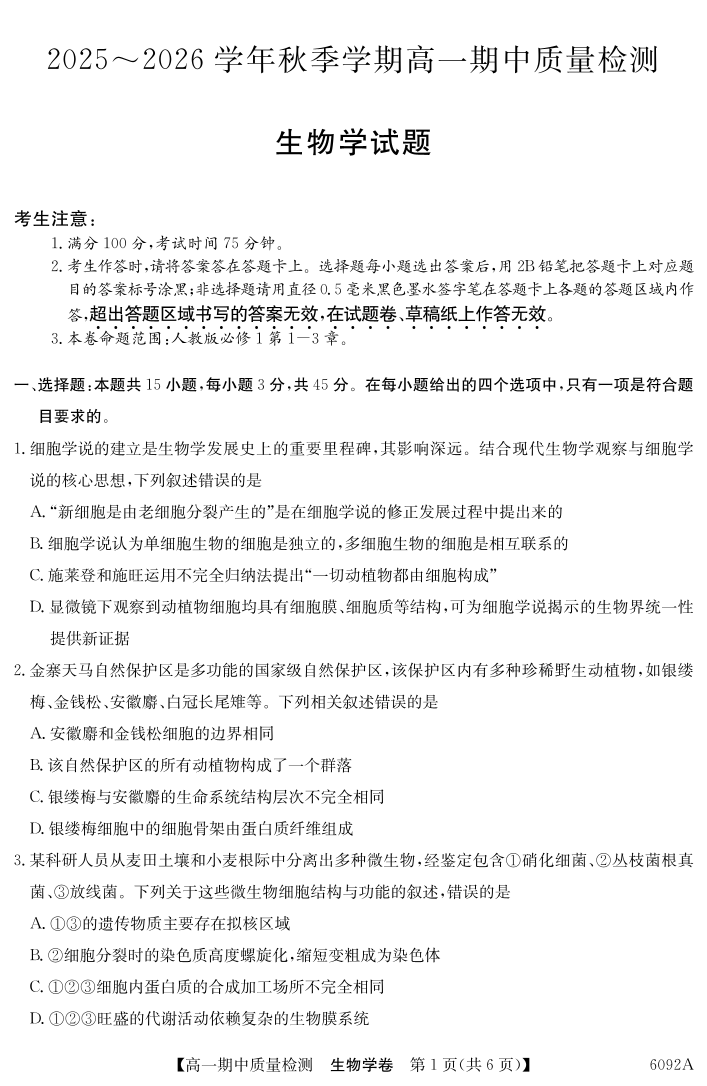 【生物】安徽省华师联盟2025~2026学年秋季学期高一期中质量检测.pdf
