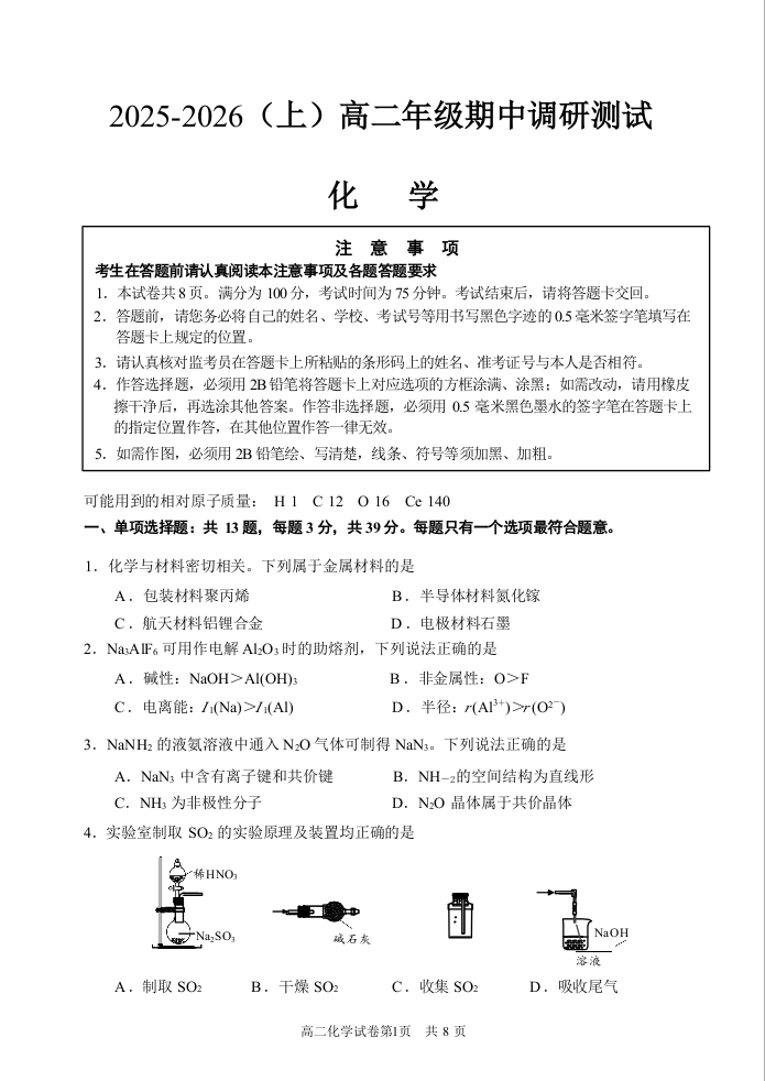 江苏省南通市2025-2026学年高二上学期期中质量监测 化学试题(含答案).docx