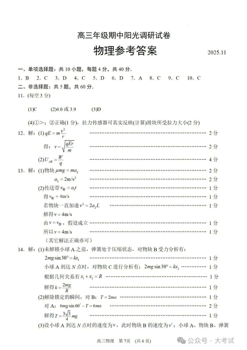 江苏省苏州市2026届高三年级上学期期中阳光调研卷 物理答案.pdf
