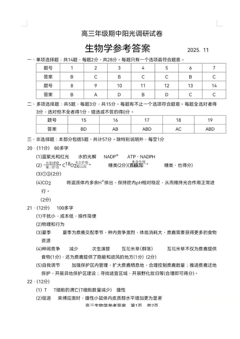江苏省苏州市2026届高三年级上学期期中阳光调研卷 生物答案.pdf