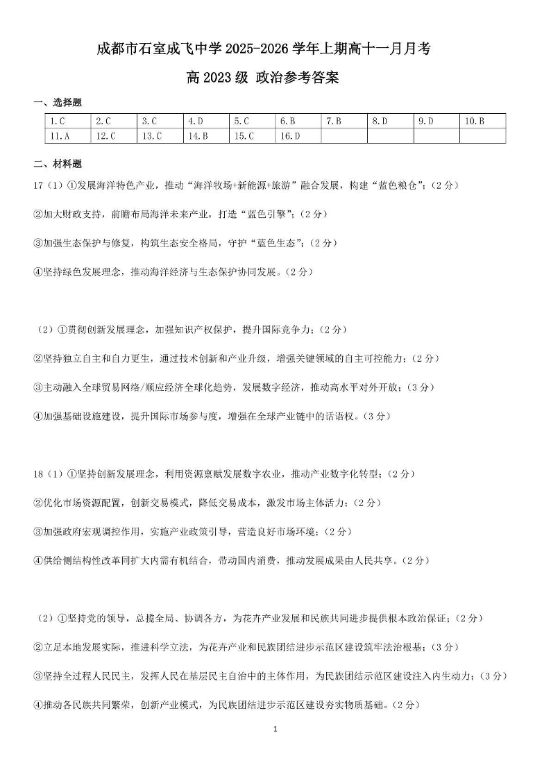 石室成飞中学2025-2026学年高三上学期11月月考 政治答案.pdf
