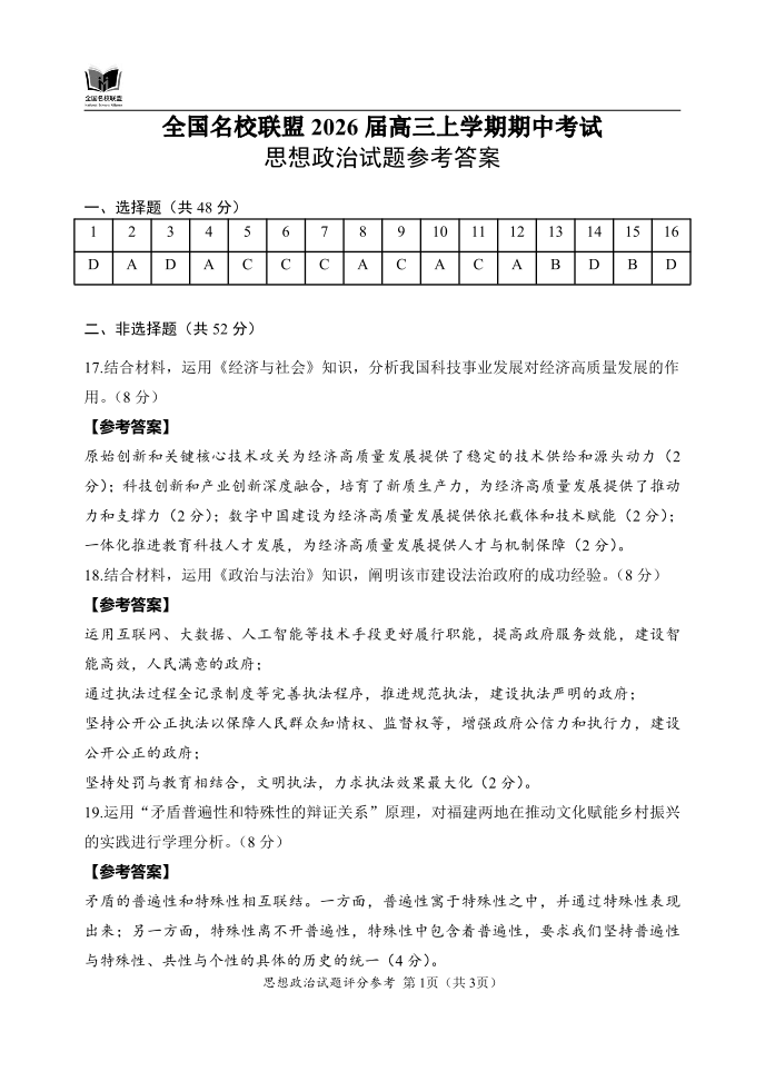全国名校联盟2026届高三上学期期中考试 政治答案.pdf