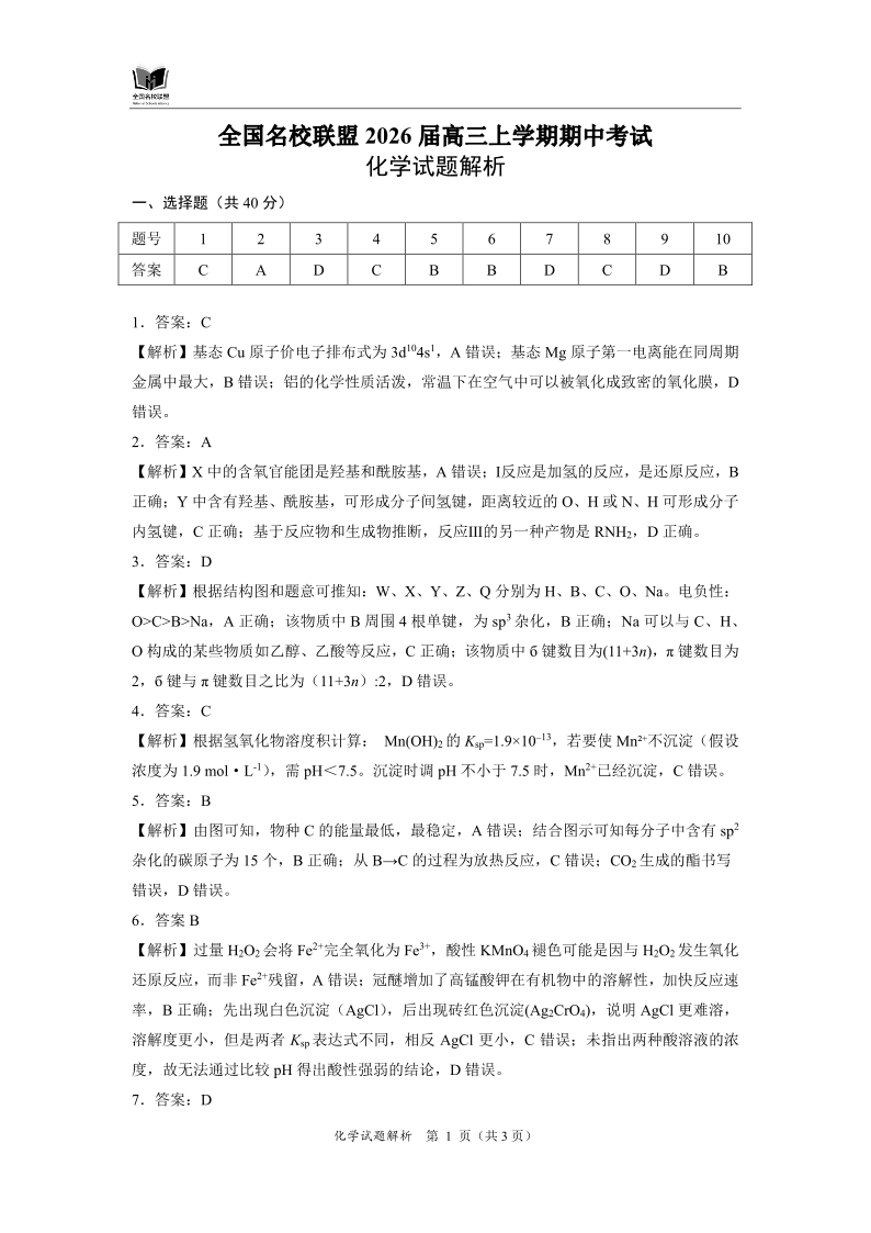 全国名校联盟2026届高三上学期期中考试 化学答案.pdf