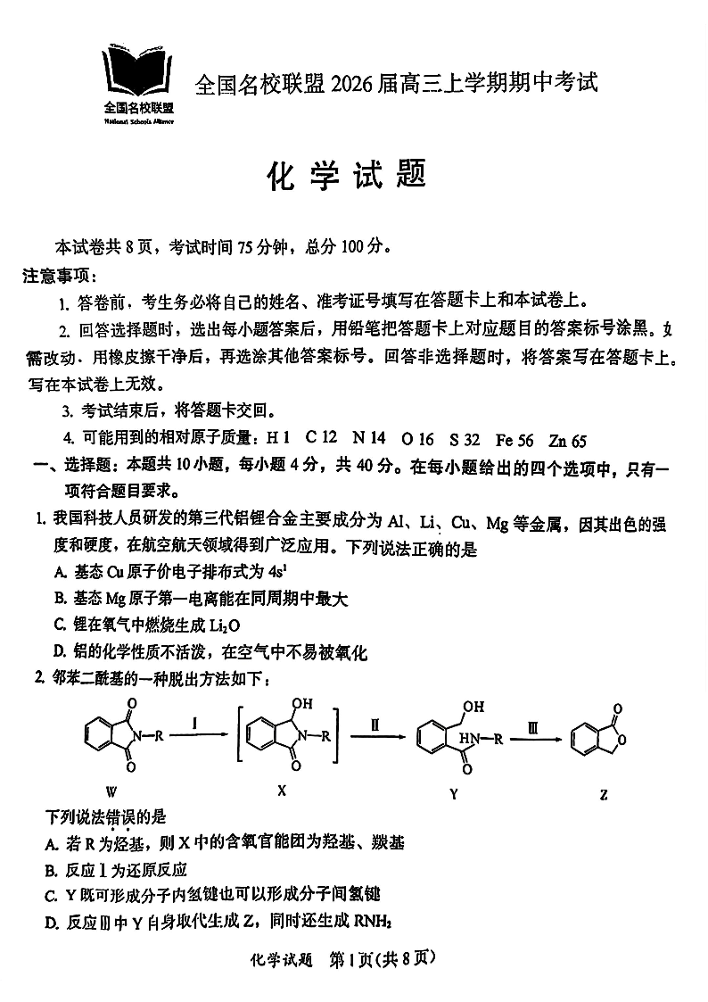 全国名校联盟2026届高三上学期期中考试 化学.pdf
