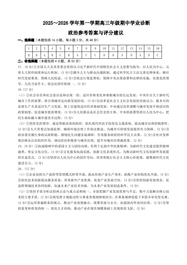 太原市2025~2026学年第一学期高三年级期中学业诊断 政治答案.pdf
