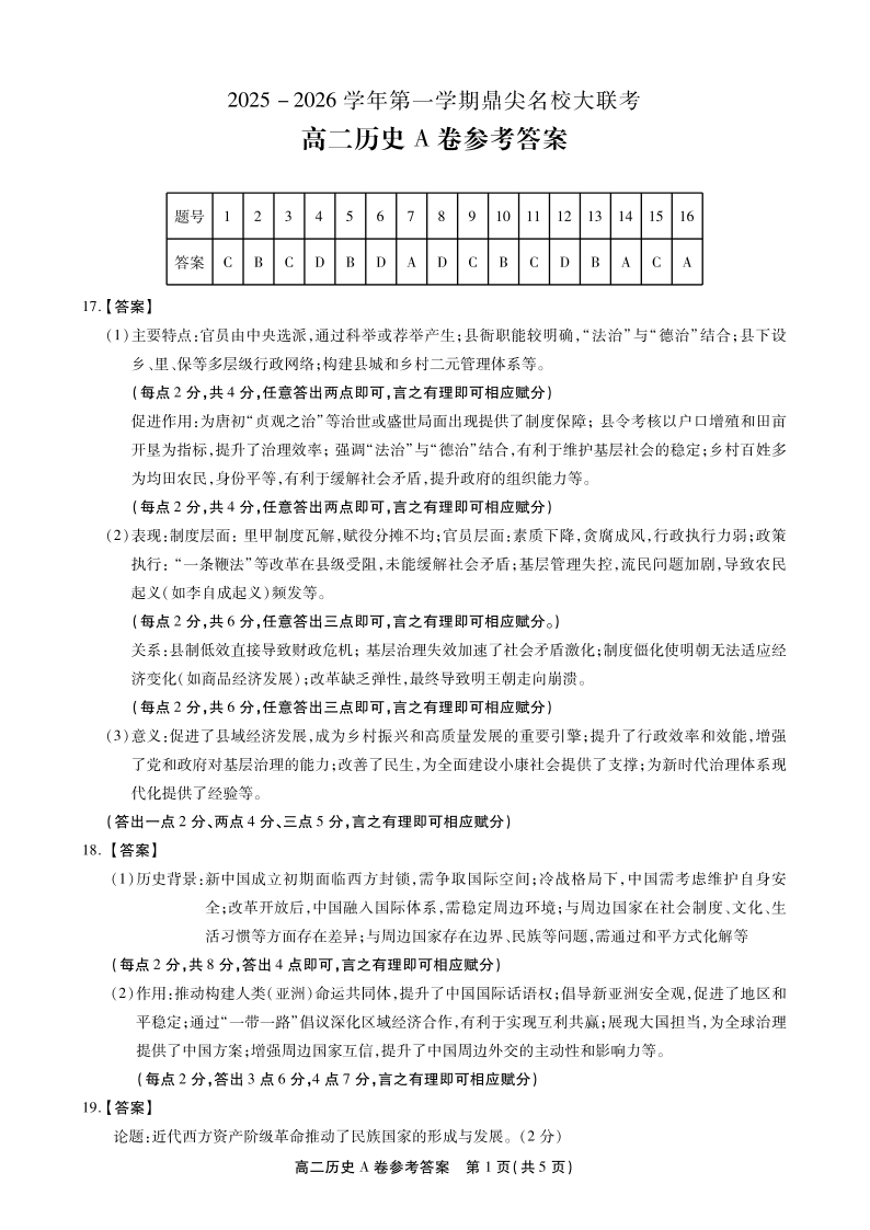 【历史A卷答案】安徽省鼎尖名校大联考2025-2026学年上学期高二11月期中考试.pdf