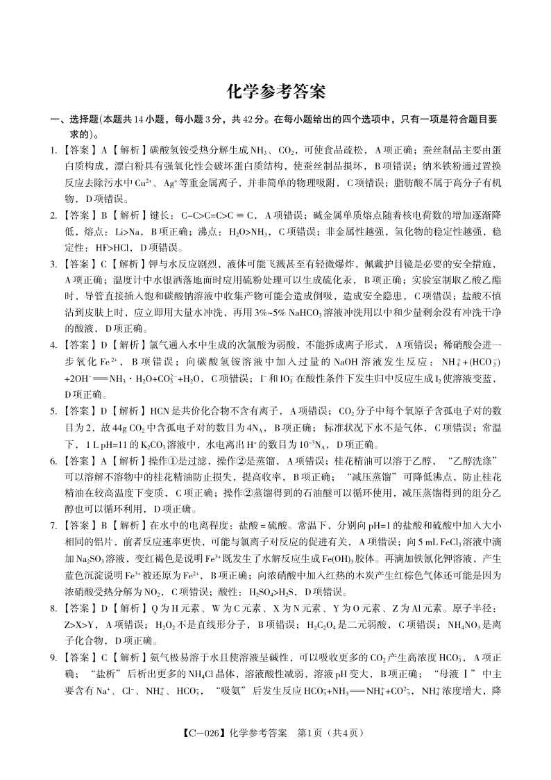 化学答案·江西省九校重点中学2026届高三年级第一次联合考试.pdf