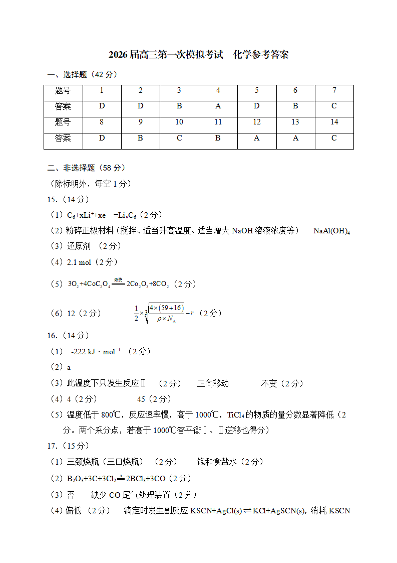 广西柳州市2026届高三第一次模拟考试化学答案.pdf