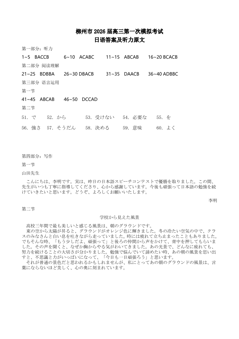 广西柳州市2026届高三第一次模拟考试日语答案.pdf