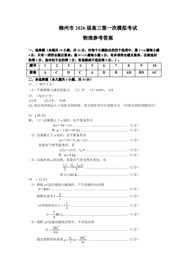 广西柳州市2026届高三第一次模拟考试物理答案.pdf