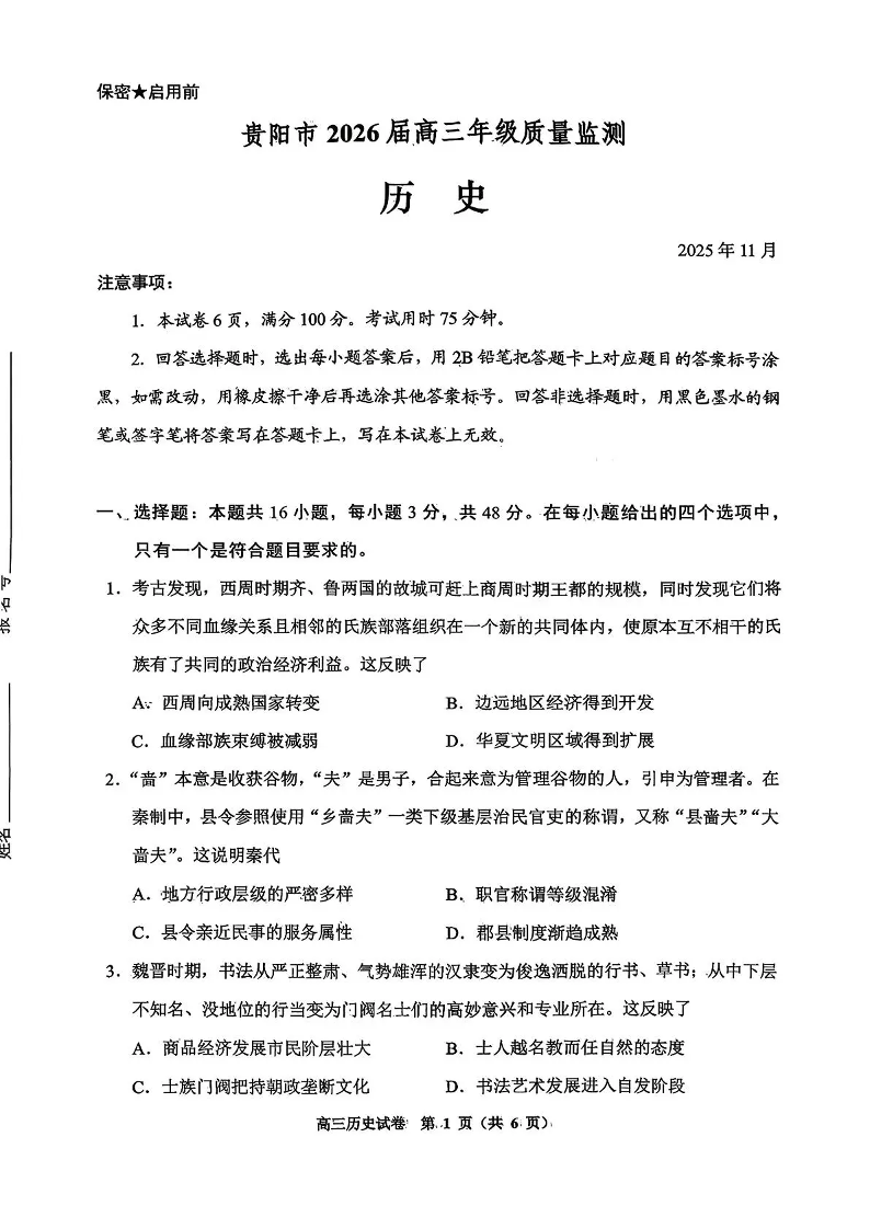 贵州省贵阳市2026届高三年级质量监测历史.pdf