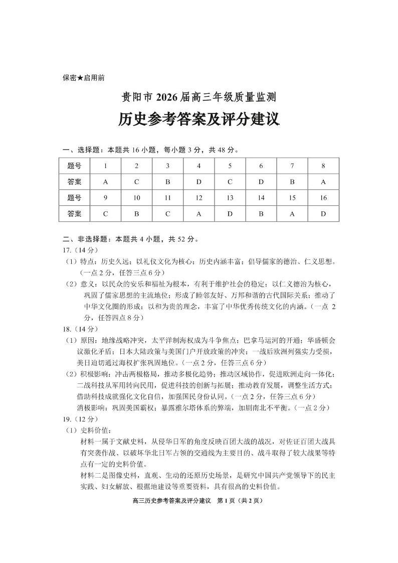 贵州省贵阳市2026届高三年级质量监测历史答案.pdf