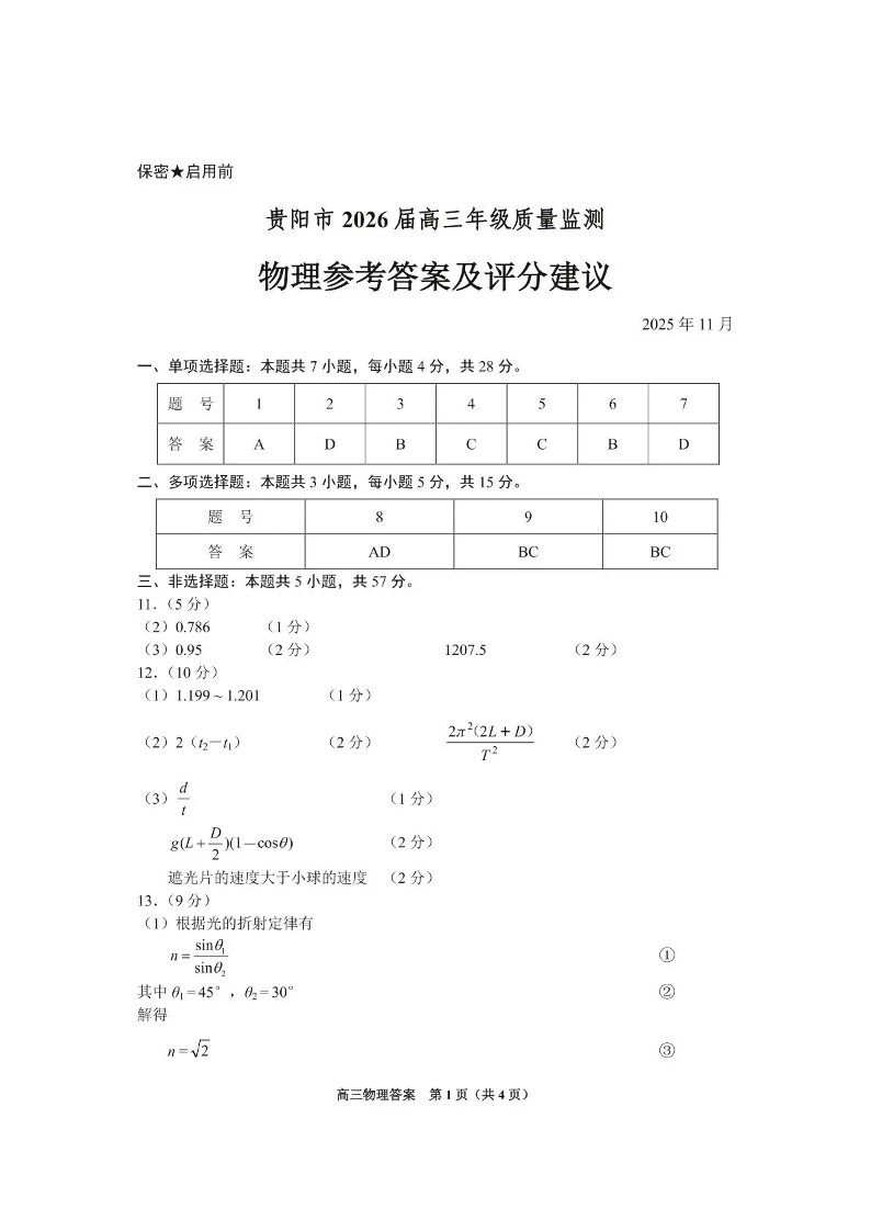 贵州省贵阳市2026届高三年级质量监测物理答案.pdf