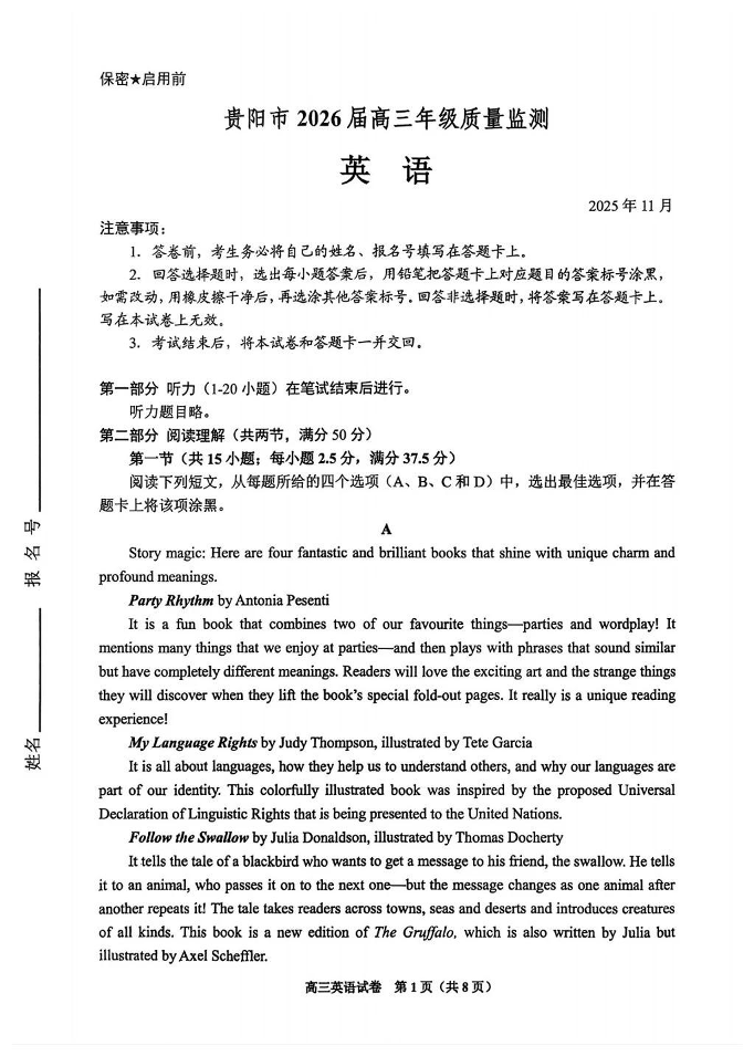 贵州省贵阳市2026届高三年级质量监测英语.pdf