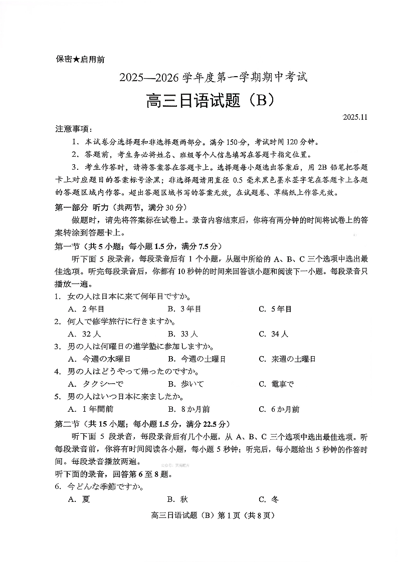 菏泽市B类高中2025-2026学年度高三第一学期期中考试日语.pdf