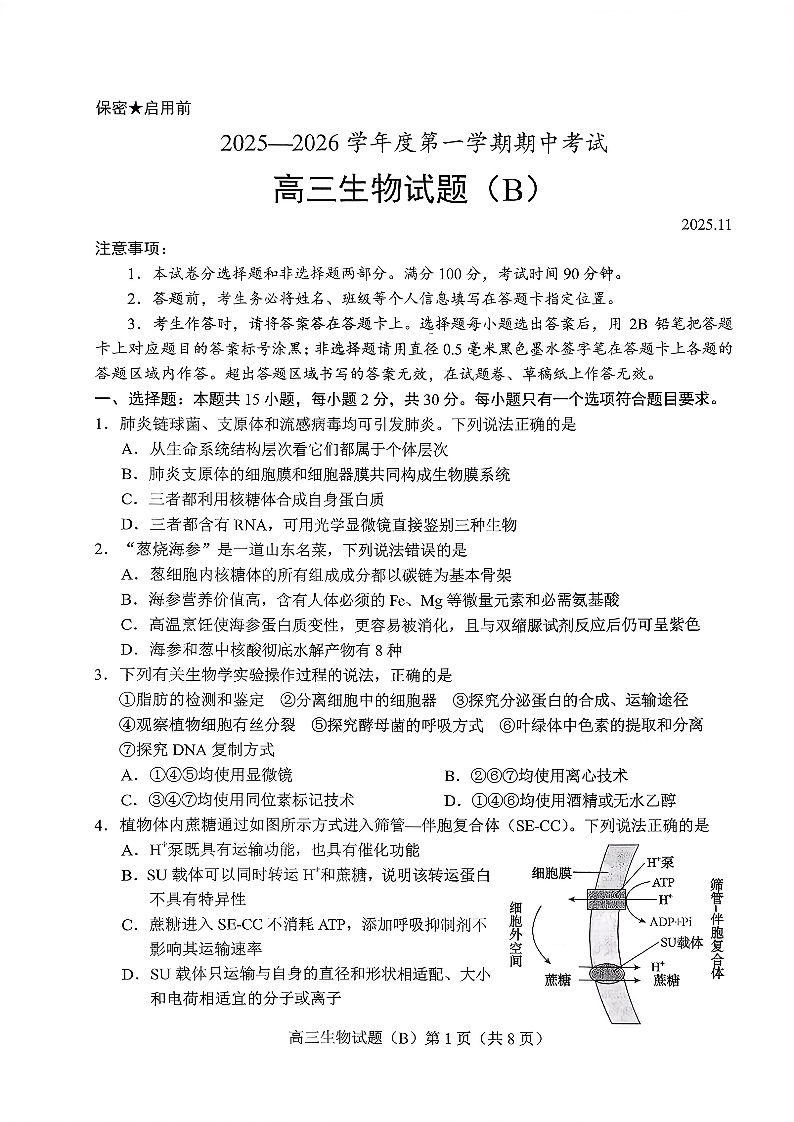 菏泽市B类高中2025-2026学年度高三第一学期期中考试生物.pdf