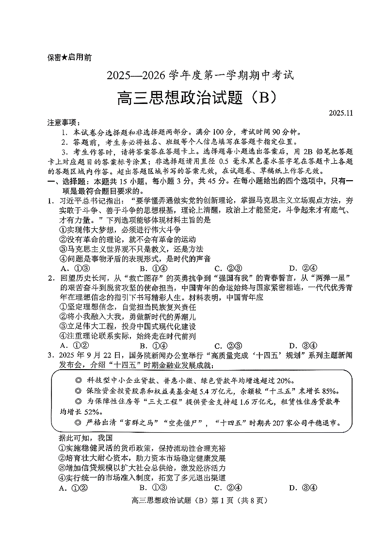 菏泽市B类高中2025-2026学年度高三第一学期期中考试政治.pdf