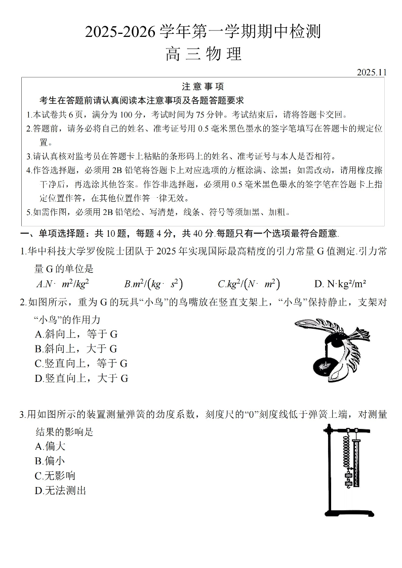 江苏省扬州市2025-2026学年高三上学期11月期中考试物理试题(含答案).pdf