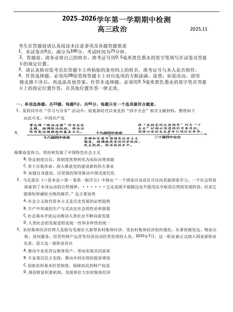 江苏省扬州市2025-2026学年高三上学期11月期中考试政治试题(含答案).docx
