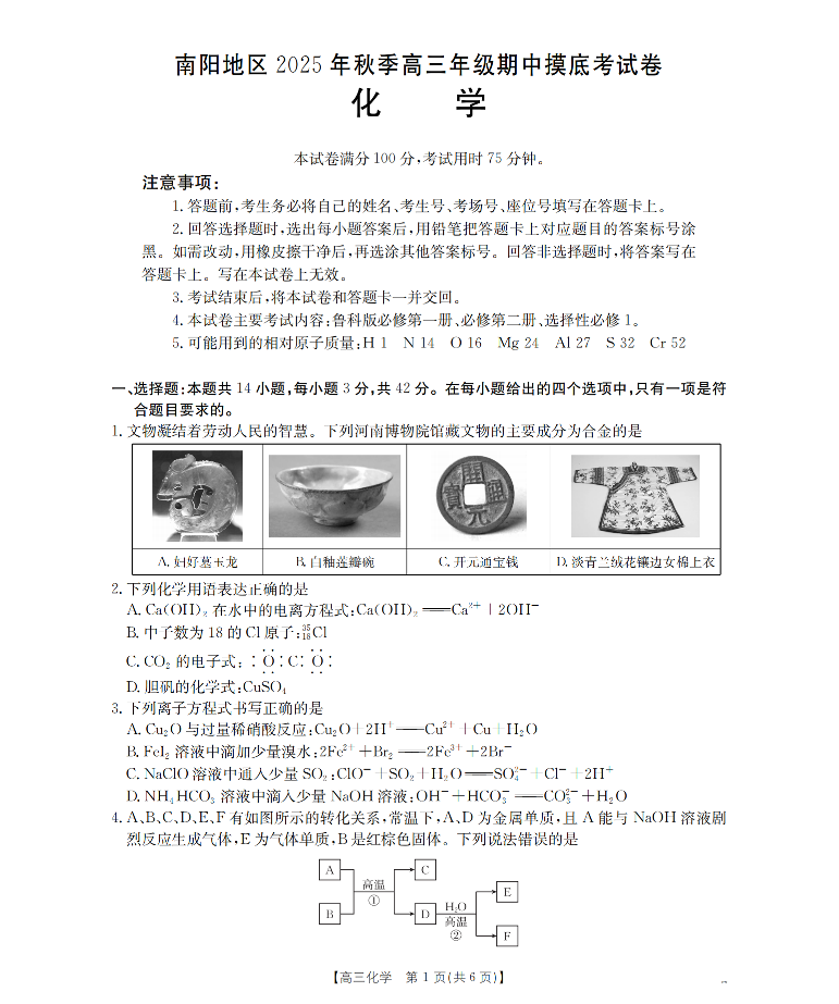 南阳市南阳地区2026届高三上学期期中摸底考试卷(26-98C)化学.pdf