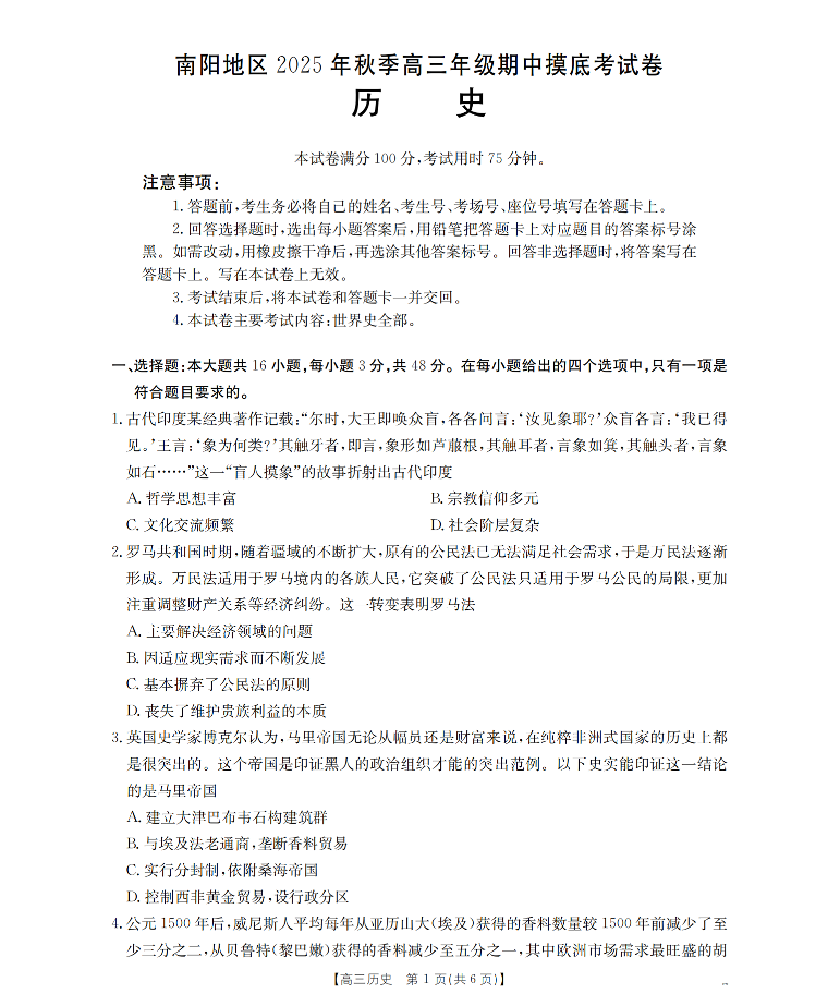 南阳市南阳地区2026届高三上学期期中摸底考试卷(26-98C)历史.pdf