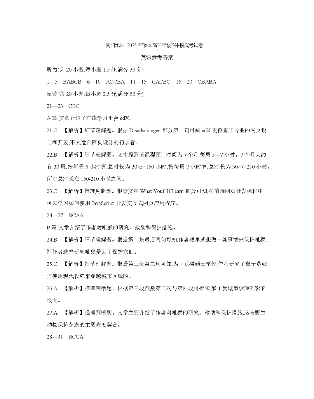 南阳市南阳地区2026届高三上学期期中摸底考试卷(26-98C)英语答案.pdf