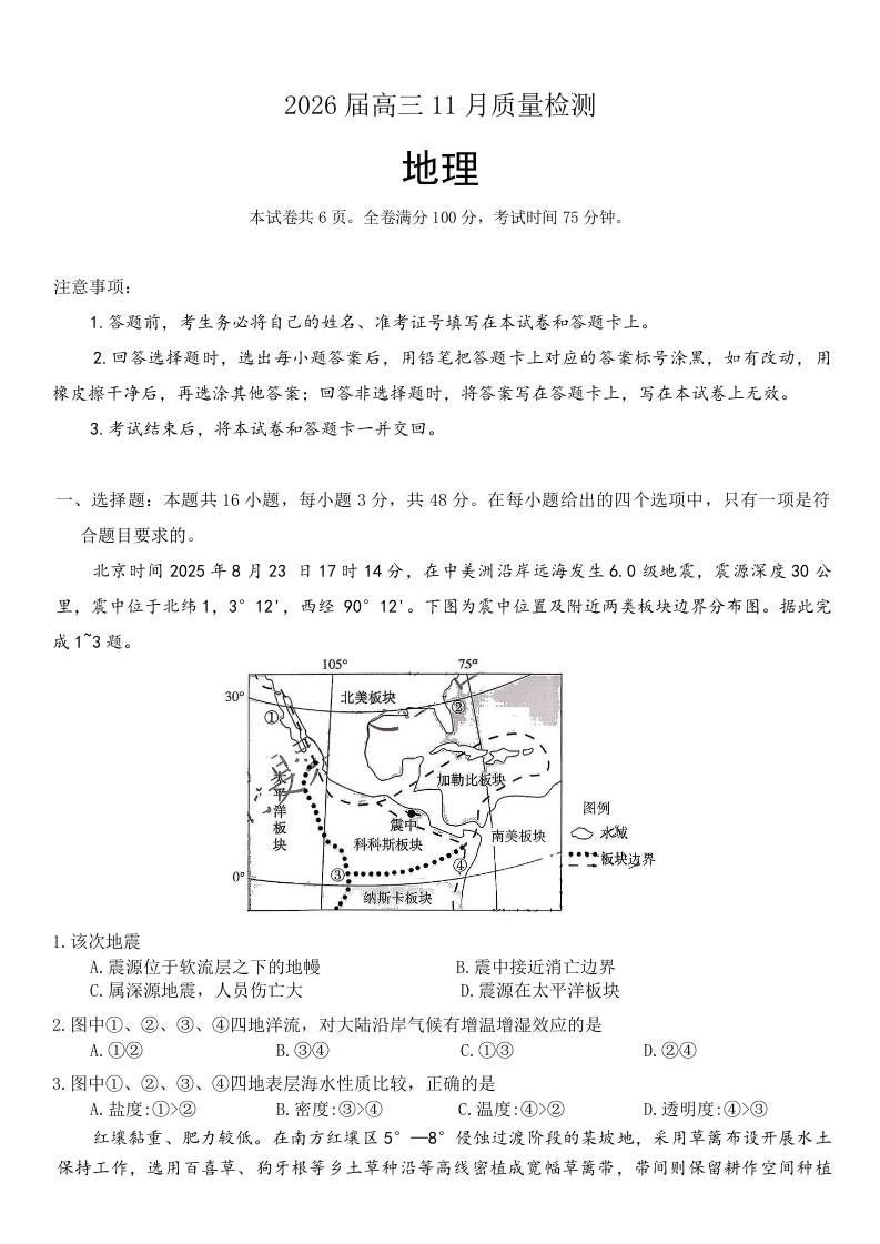 天壹名校联盟长望浏宁四县市2026届高三11月期中质量检测地理+答案.docx