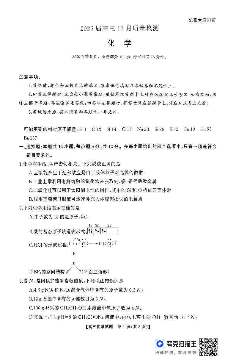 天壹名校联盟长望浏宁四县市2026届高三11月期中质量检测化学.pdf