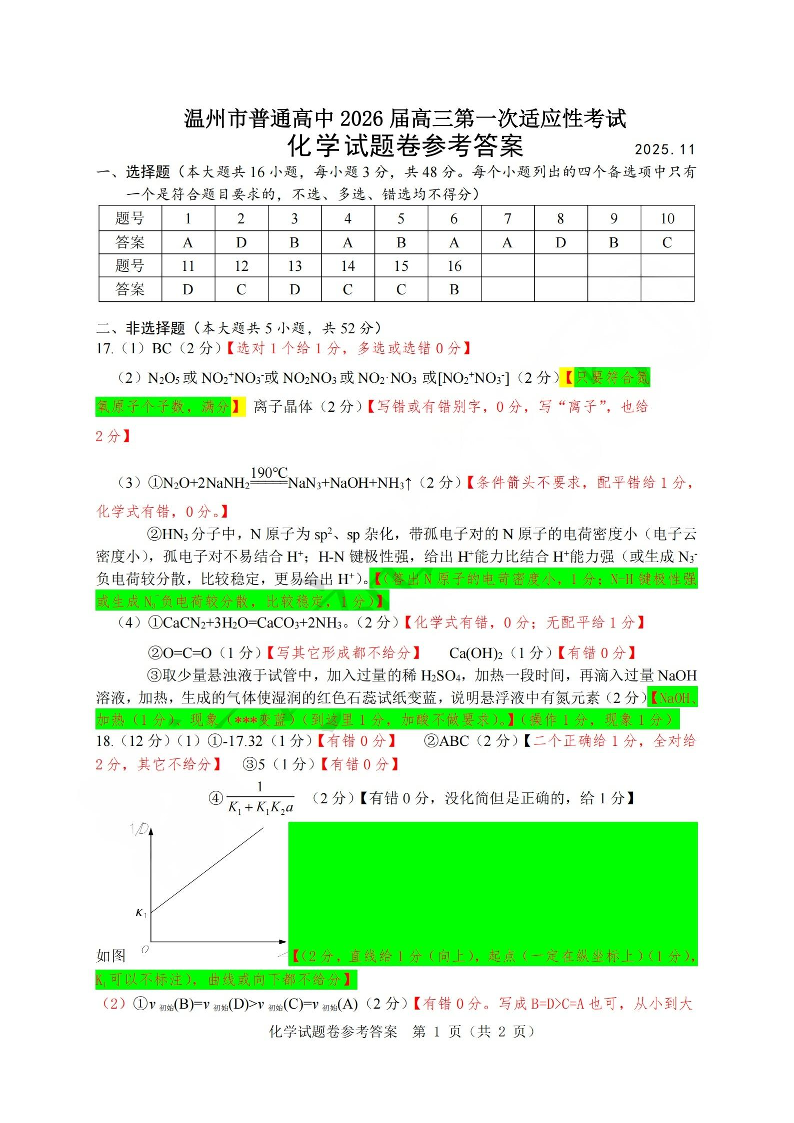 温州市普通高中2026届高三第一次适应性考试化学答案.pdf