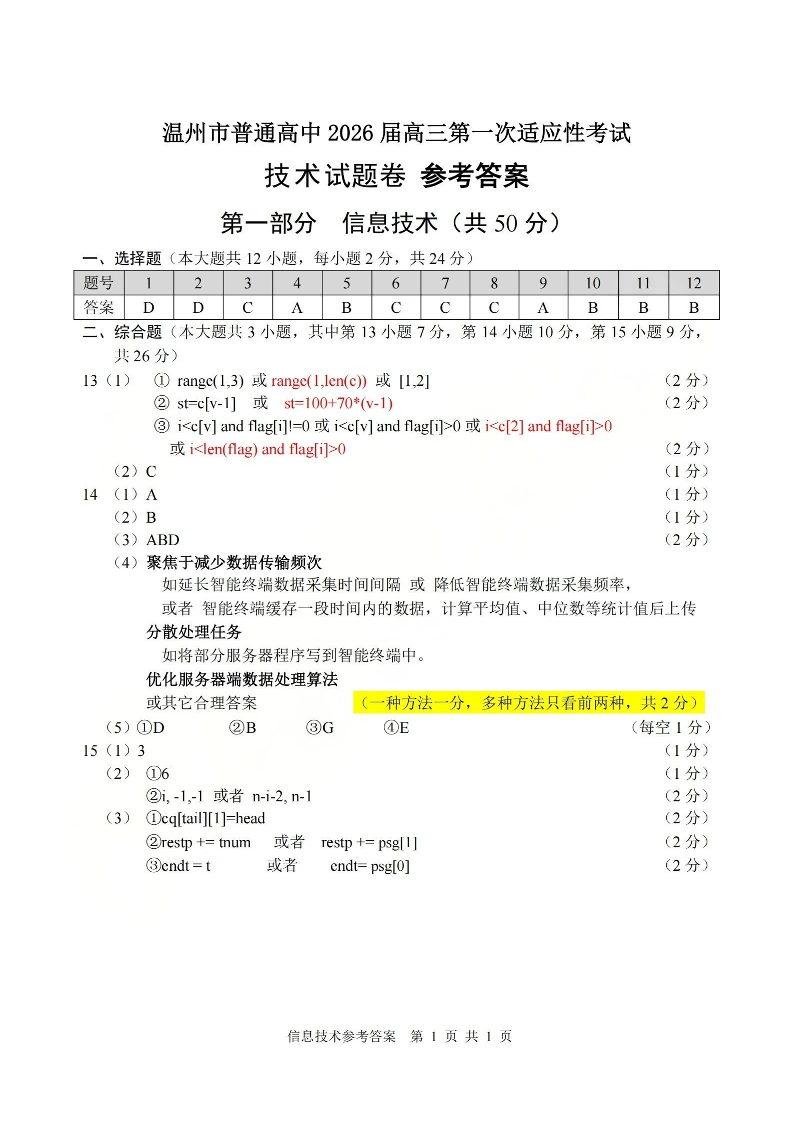 温州市普通高中2026届高三第一次适应性考试技术答案.pdf